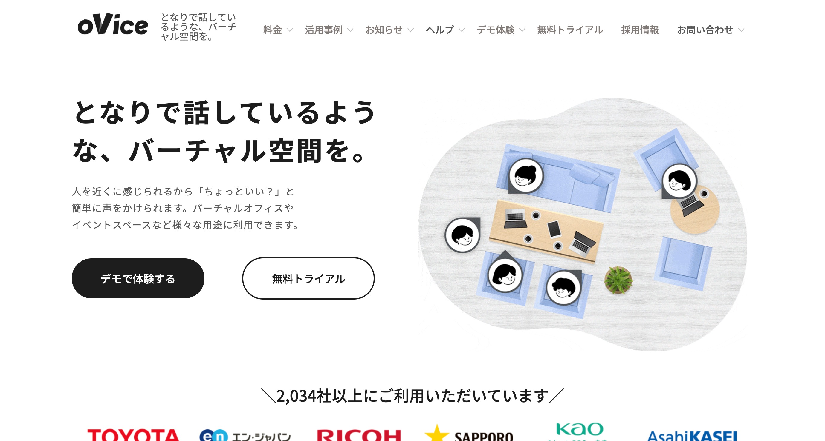 oViceは平面な空間上に丸いアイコンが表示されて、そのアイコン同士の距離感によって音声の強弱が変わるコミュニケーションツールです。会議室やコミュニケーションアイコンを作れば、そこでWebカメラを使ったコミュニケーションも可能です。Webブラウザだけ、専用アプリが不要なのは利点です。