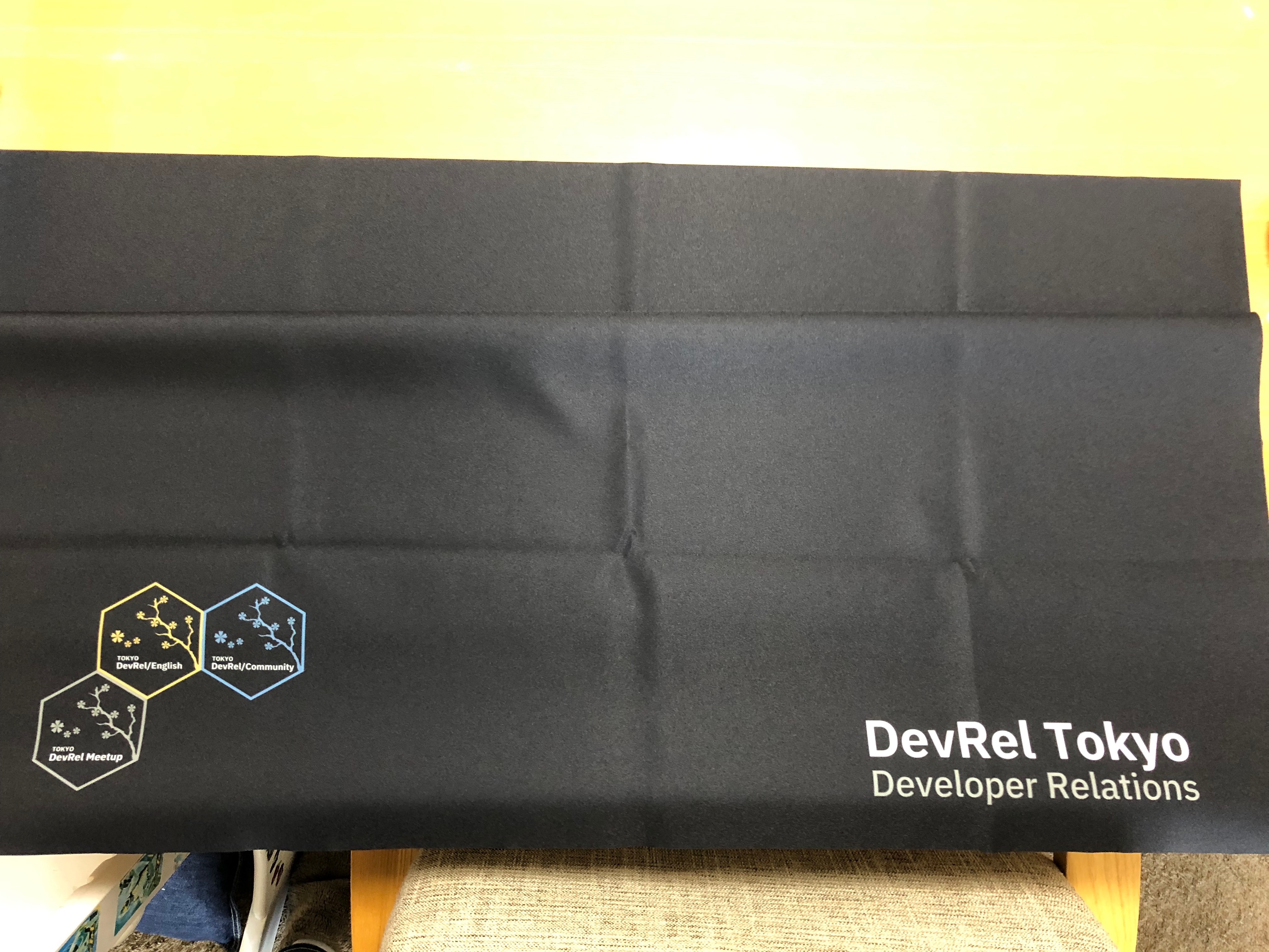 2月7日にcanvathにてサークル布の受注が開始しました。そこでDevRel Meetup in Tokyoとしても初のサークル布作成に至っています。デザインはもちろんコミュニティロゴを含めデザインしている@taiponrockにお願いしています。
