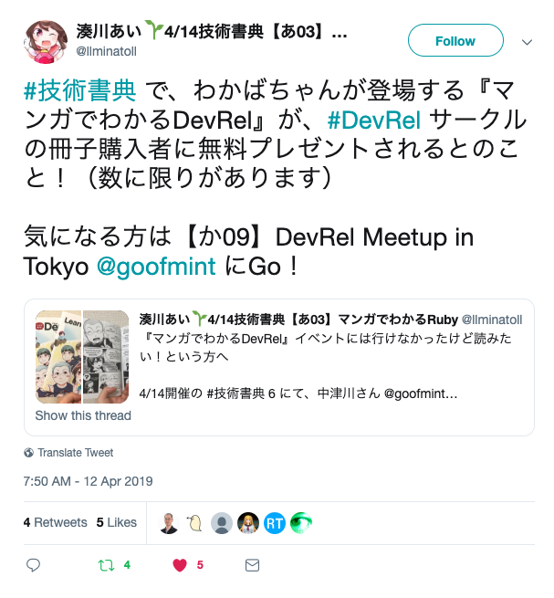 今回はDevRelCon Tokyo 2019で全員配布した「マンガで分かるDevRel」(湊川さん作)を300冊用意していました。これを書籍を一冊でも買ってくれた方に一人1冊プレゼントしました。ノベルティ代わりなので、これは持ち出しになってしまいますが、300冊25,890円で1冊あたり86円と単価で見れば割とリーズナブルなノベルティになります。それに対して効果は絶大で、この冊子を目当てに買っていく人もいるほどです。拡散力という意味においてもものすごいパワーがあります。わかばちゃん、恐るべし…。