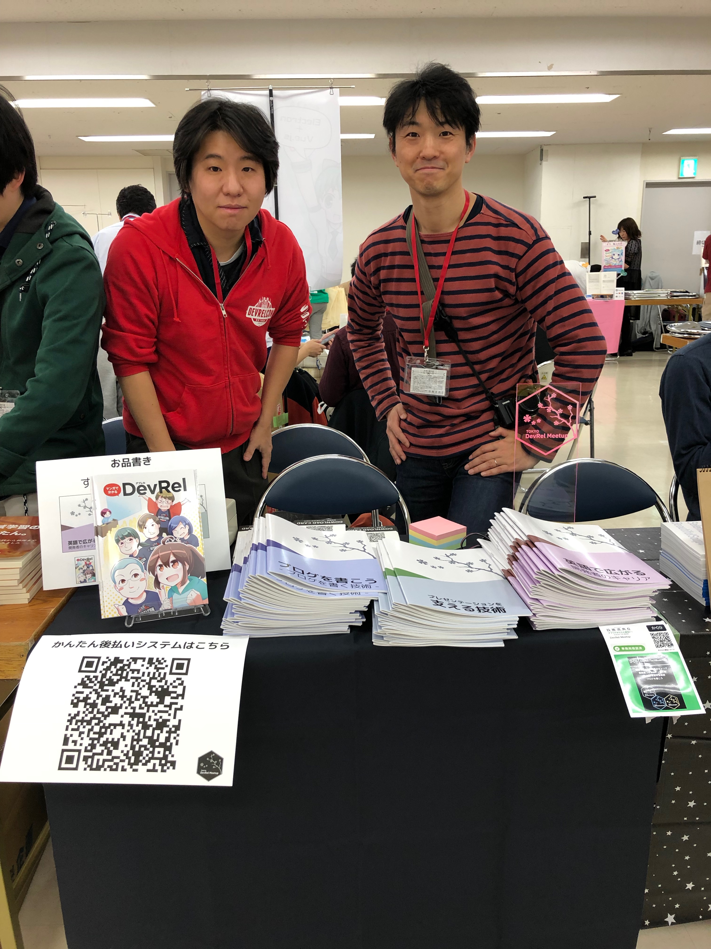 DevRel Meetupでーす!技術を伝える技術たくさんとりそろえてます!英語、プレゼン、ブログがあります!いまなら、無料(ノベルティー)で、かわいくDevRelが分かる湊川さんのマンガ本もついてまーす。各種見本誌あります。手にとってご覧くださいー。よろしくお願いしますー。