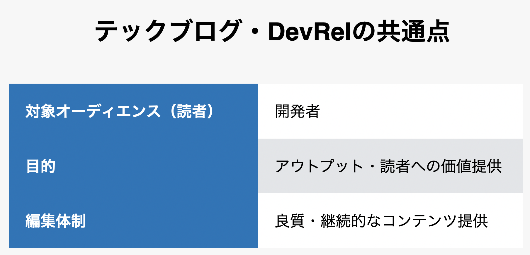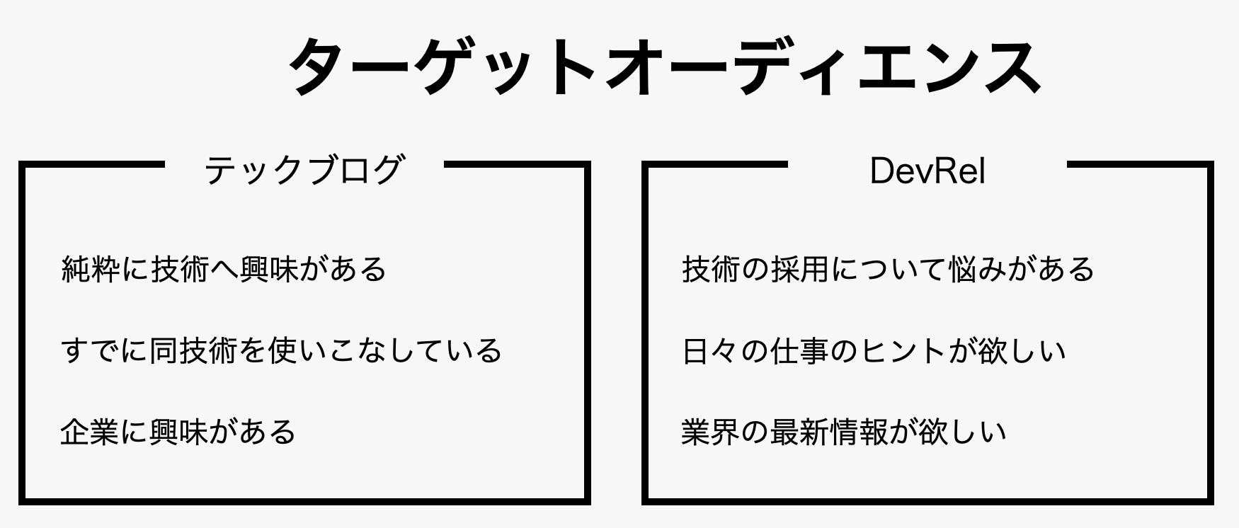 テックブログもDevRelも、ターゲットオーディエンスは開発者です。開発者に向けて技術情報を提供することが目的です。