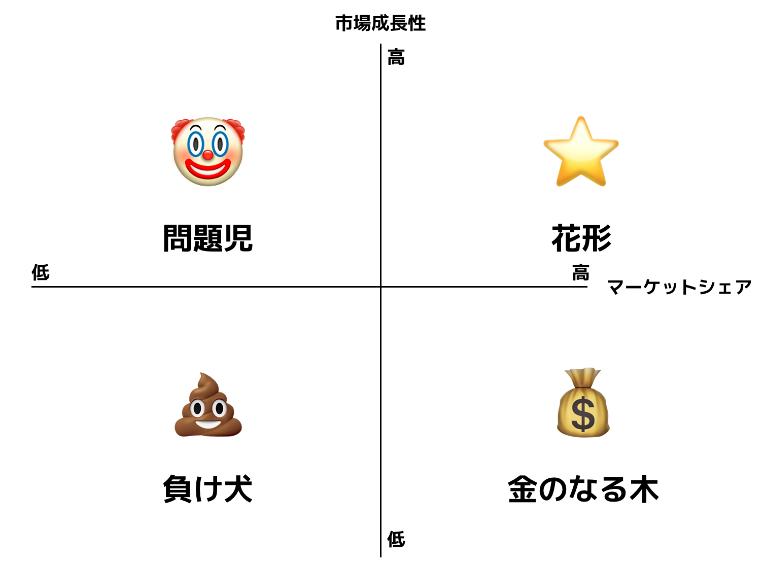 これは既存製品や機能を花形、金のなる木、問題児、負け犬の4つに分類します。もちろん投資していくべき分野は花形になるでしょう。マーケットシェアが高く、市場成長性が高いので、追加投資した分だけ収益向上が見込まれます。逆に金のなる木は高い市場成長性は望めないのでメンテナンスモードであったり、シェアを維持すれば十分と言えるでしょう。負け犬については撤退や売却を考えるべき分野です。