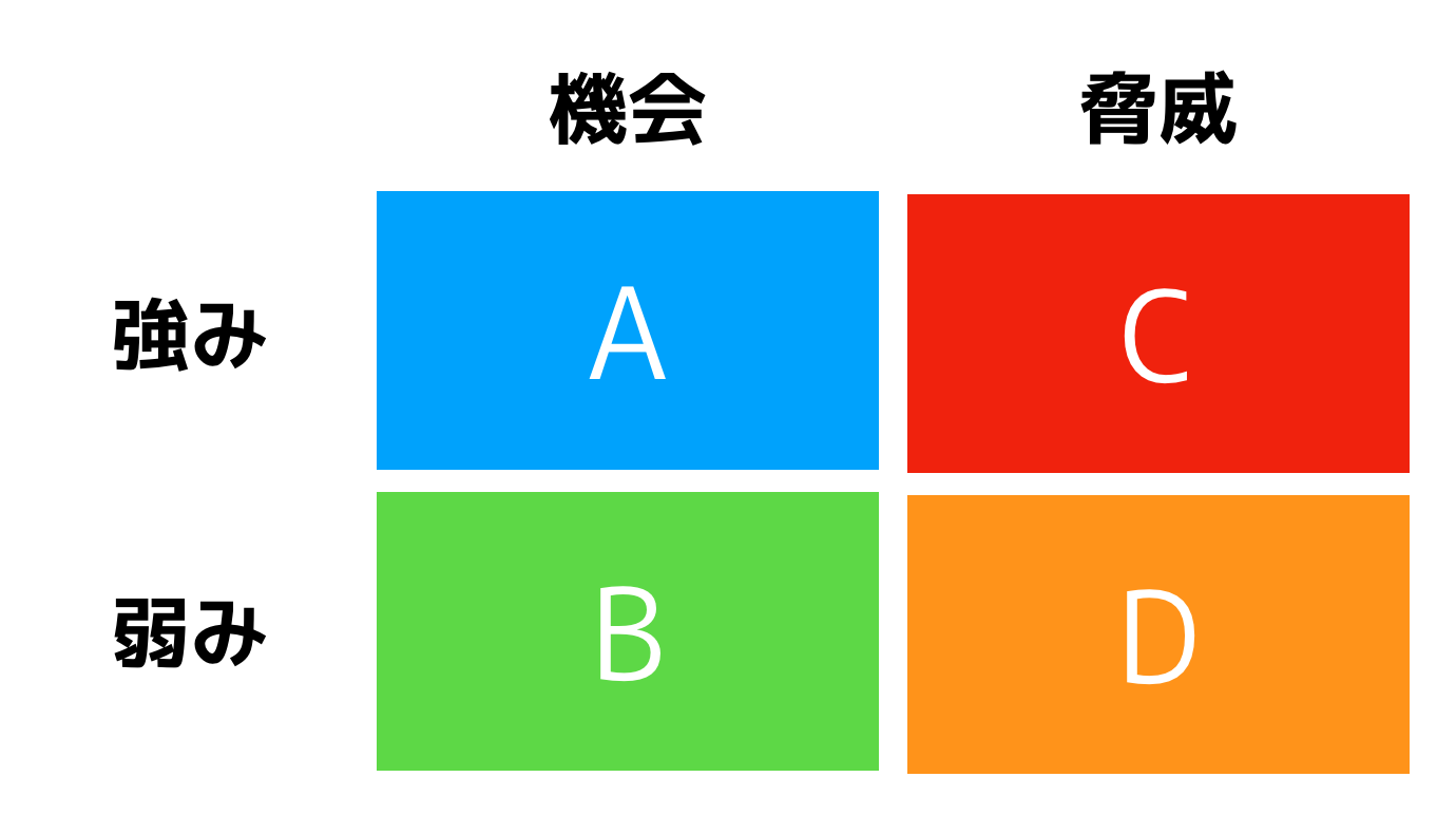 自社の強みと環境機会を掛け合わせる(A)、逆に外部からの脅威に対抗する(B)、弱みを表に出さないための工夫(C)、弱みにつけ込まれないようにする工夫(D)などが見えてきます。戦略としては機会×強み、もしくは機会×弱みを伸ばしていくのが一般的でしょう。