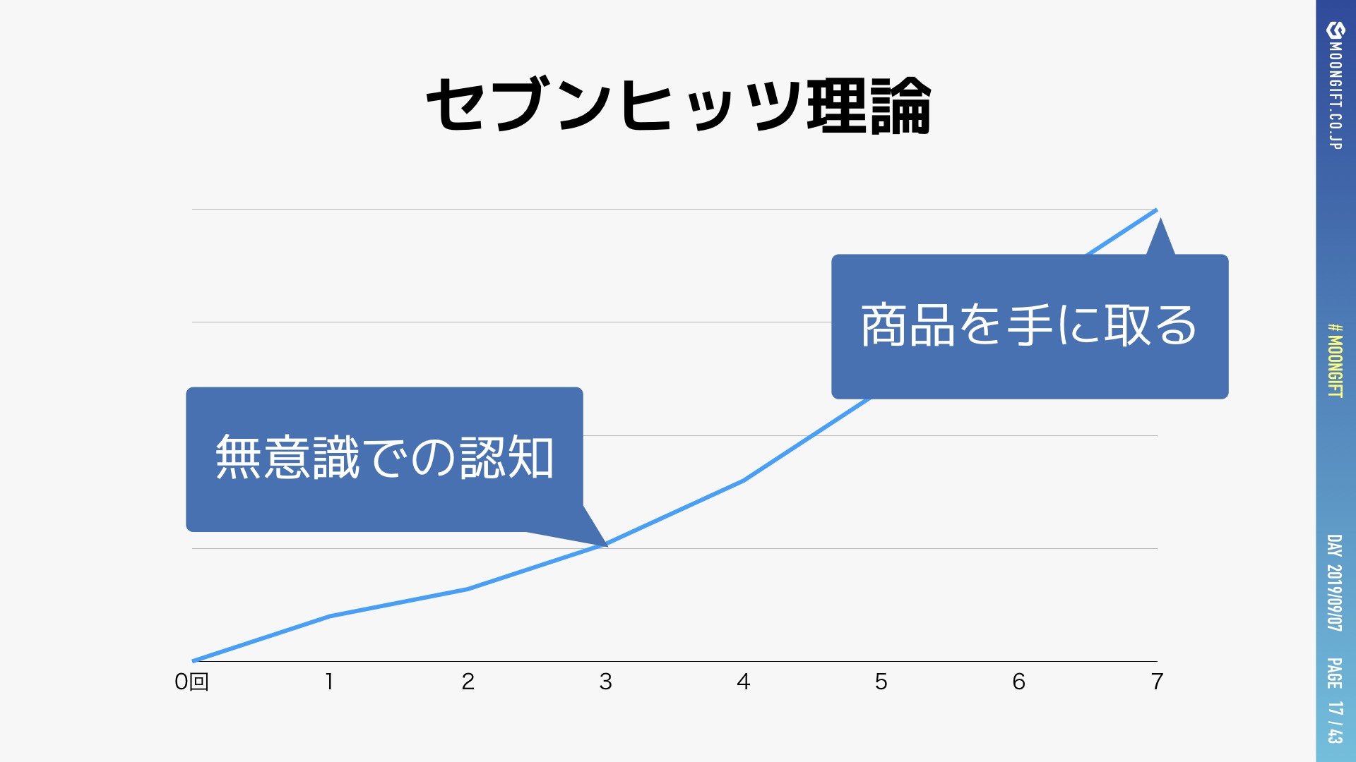 この考えをベースにした「セブンヒッツ理論」があります。これは同じ商品に関して3回接触すると、そこでようやく認知して、7回目の接触で手に取るという考え方です。例えばテレビCM、電車を待っている時の看板、さらに電車のつり革広告。ここまでの3回の接触でようやく認知を得ます。さらにスマホ広告、Webサイト広告、コンビニのポップ…と続いてようやく七回目に商品を目の前にして手に取る訳です。