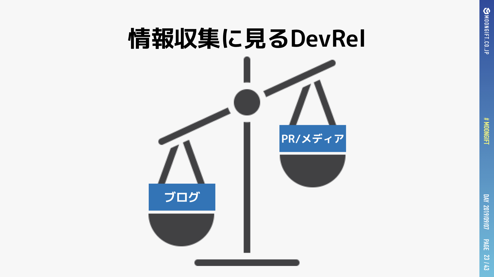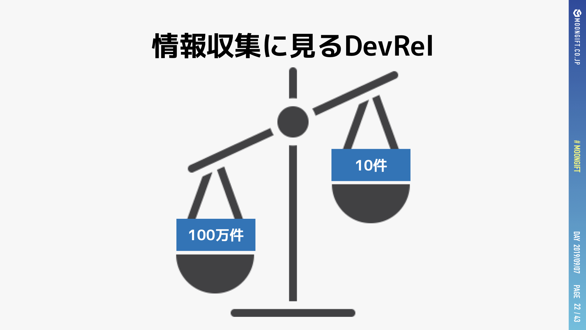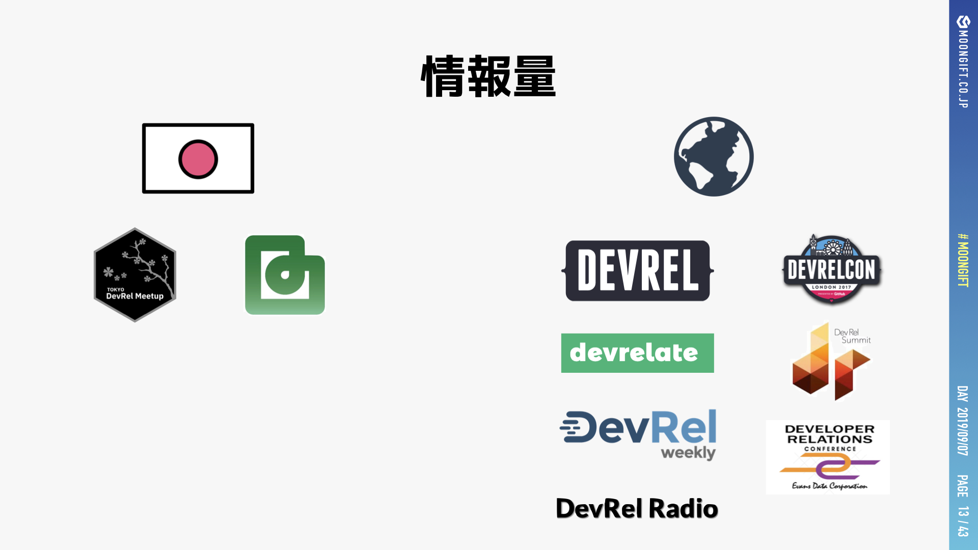 AKBに興味はないんですが、彼女たちのコンセプトは会いに行けるアイドル、だそうです。日本の開発者についても、我々が勉強会に参加するだけで会えます。これからDevRelを行いたいという相談に乗ることがあるのですが、その多くがコミュニティに参加したことすらありません。DevRel担当者であれば、まずコミュニティに参加するのがお勧めです。会いに行ける開発者、これはとても貴重です。