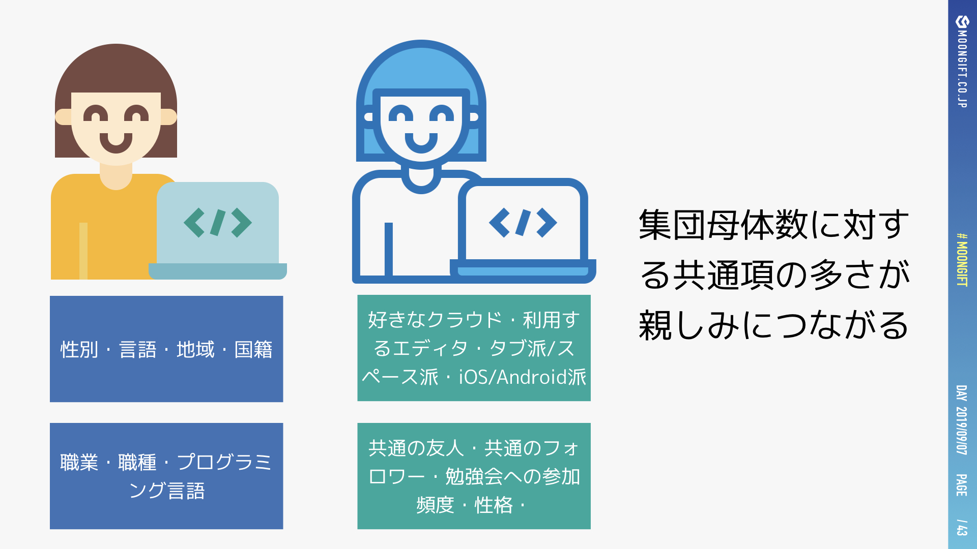 精神的共通点とはすなわち、心の距離です。同じ製品を良いと感じている、同じ部分を評価しているといった感情経験の共通点です。物理的共通点とは住んでいる地域、話している言語、職業、職種などの共通点です。