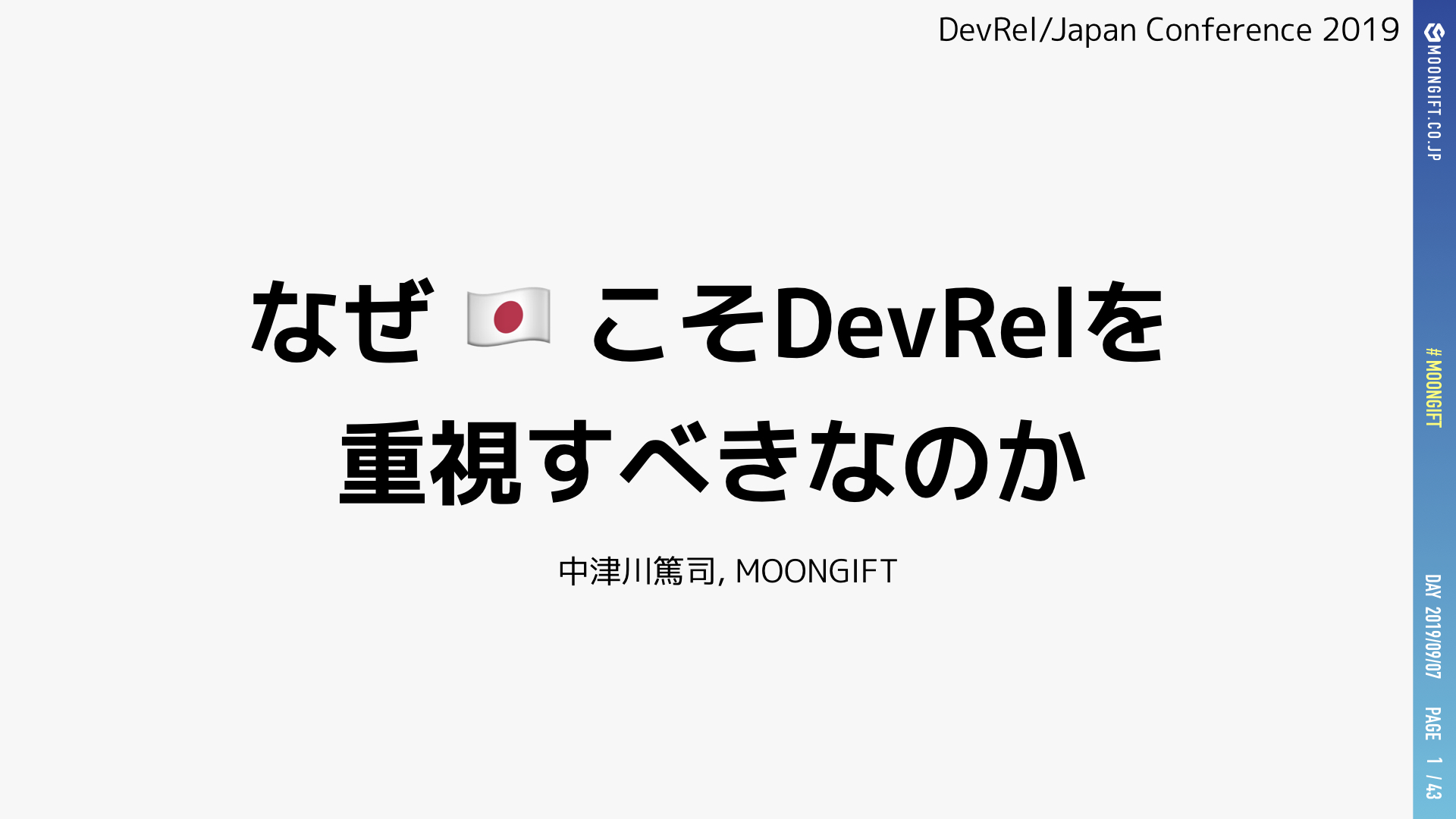 DEVREL/JAPAN CONFERENCE 2019が無事、9月7日に開催されました。カンファレンスの内容については別記事として、ここでは自分の登壇の全文起こしを紹介します。