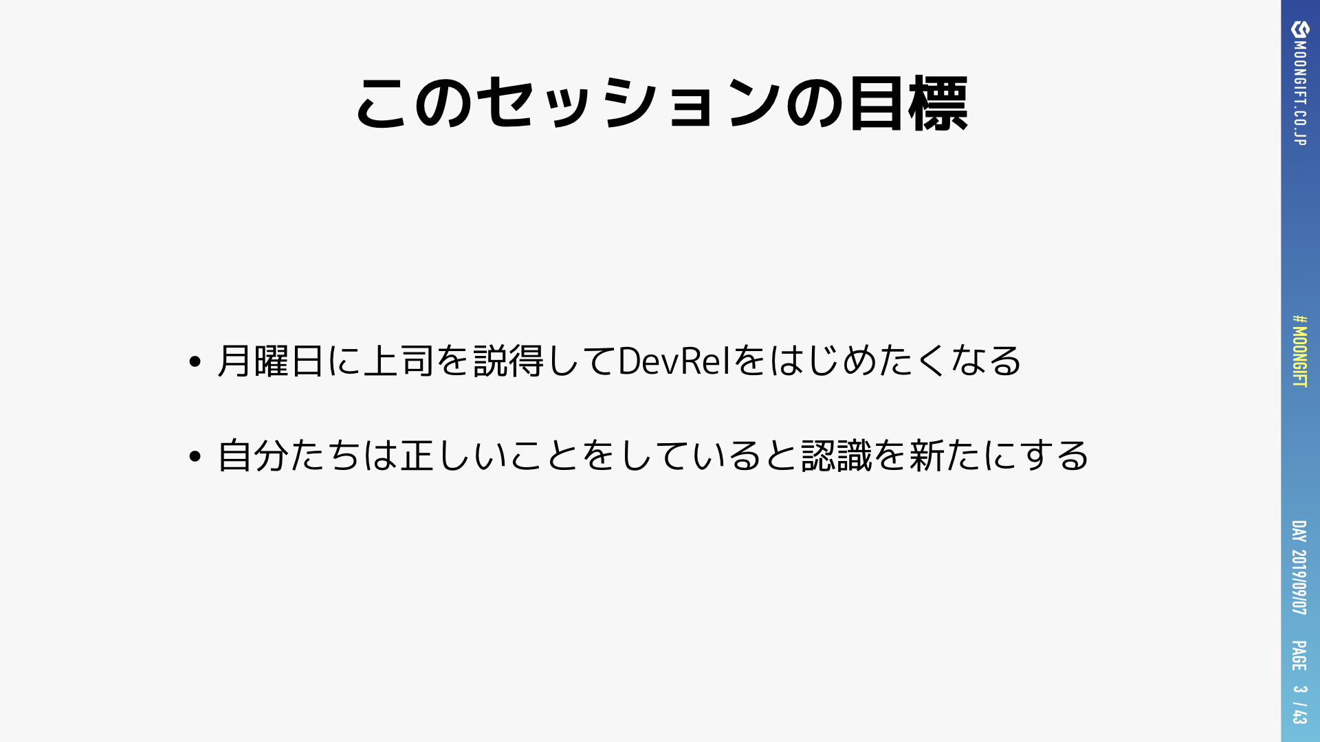 私がお話しするのは、日本でこそDevRelをしっかりやろう、という話です。まだDevRelをやっていなかったり、DevRelがどんなものか、今日のカンファレンスを通じて学んだ方々が、明後日の朝に上司を説得したくなるような内容になれば良いなと思っています。また、すでにDevRelをやっている企業の方が、自分たちは間違っていないんだと認識を新たにしてくれれば嬉しいです。