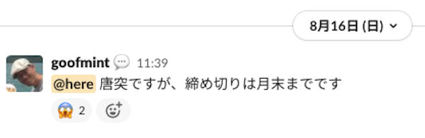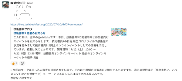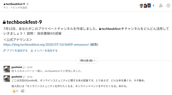7月12日に専用のチャットチャンネルを作成しました。ちなみに技術書典9は9月12日開催です。つまり2ヶ月間しか猶予はありません。