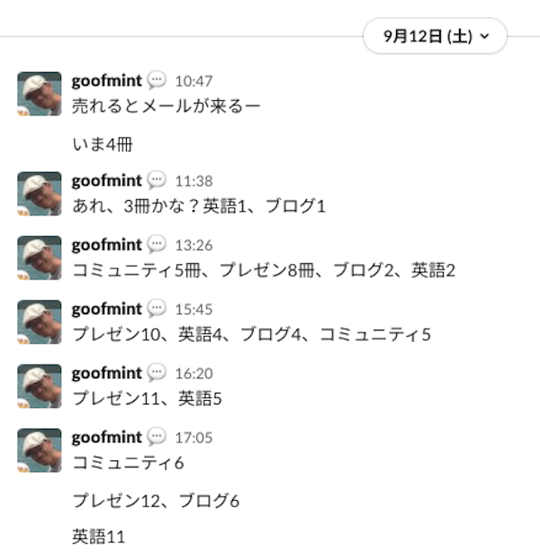 技術書典9では売れる度にメールが送られてくるしくみになっていました。後は売り上げ管理で数字を確認できるので、定期的にメッセージを送っていました。やはり売れるとうれしいもので、執筆者どうしでなるべく早く情報共有したいと考えていました。