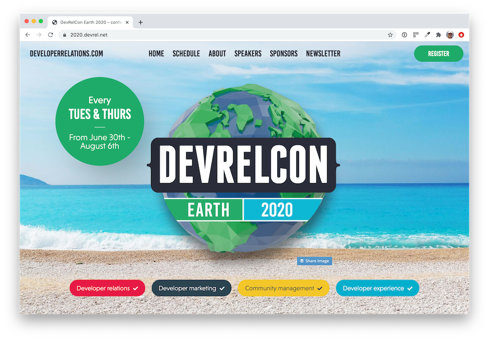 2020年は色々と大荒れの状態ではありますが、6月30日からDevRelCon Earth 2020というカンファレンスをオンライン開催しています。これはDevRelCon London/SF/Tokyoの3チームが合同で行っているカンファレンスです。それぞれ8時間ずつの時差があるため、毎週日本時間0時からオンラインミーティングを行っています。これも強制された訳ではなく、個人的な興味と得られがあるだろうということでトライしています。