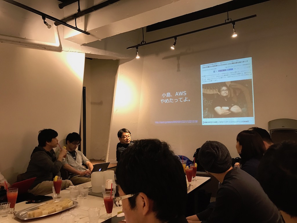 登壇者は元AWSのマーケティング統括者の小島(おじま)さんで、JAWSを作り上げた人としてIT業界ではよく知られている方です。正直、小島さんが喋るとなるともっと大勢でも集まるのですが、あまり人数が多いと発表側と聞き手側で分離してしまい、ディスカッションがあまり盛り上がらないだろうと考えてあえてごく小規模なスペースを設定しています。
